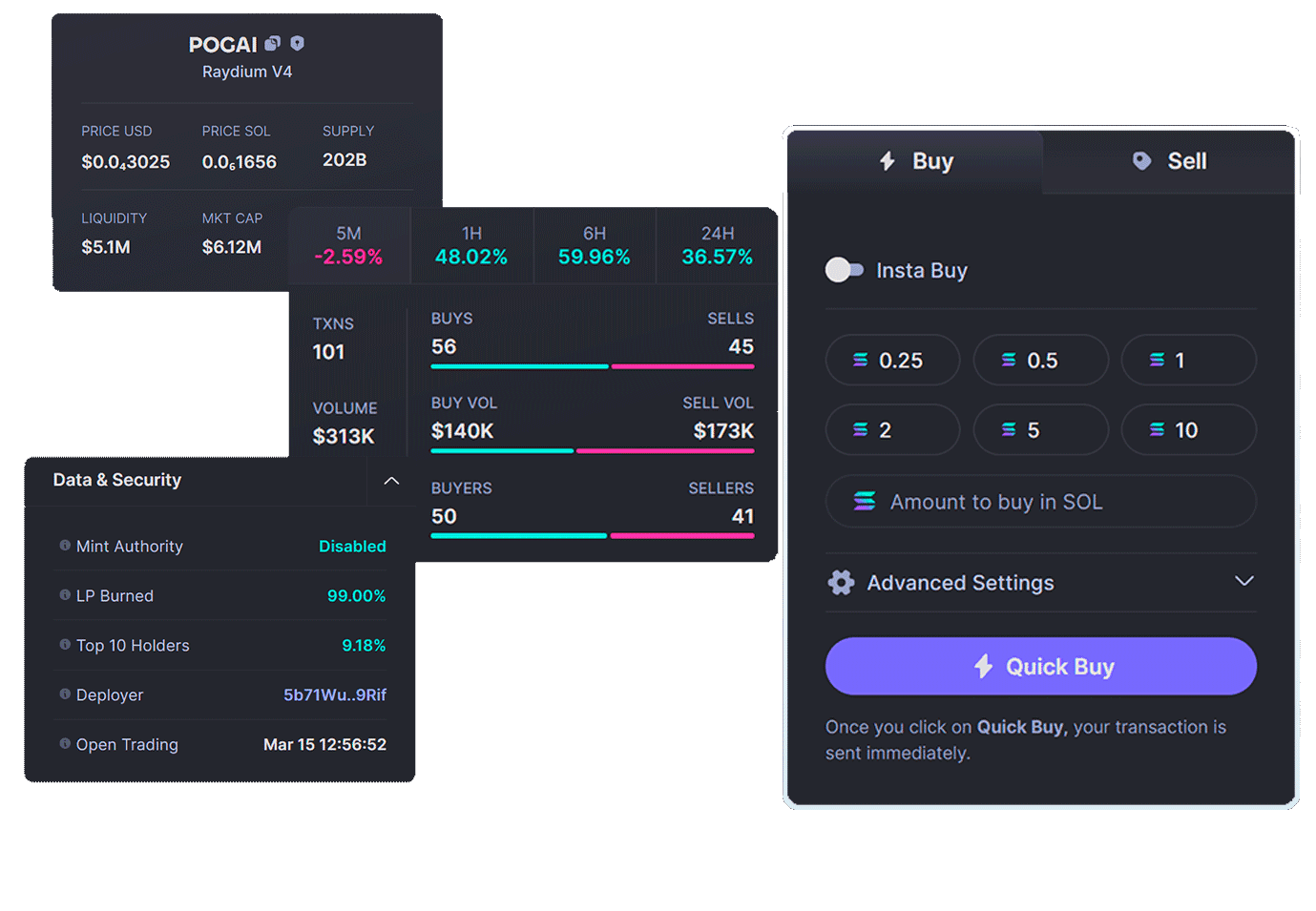 Trades are executed at lightning speed, leveraging Solana’s high-performance blockchain.